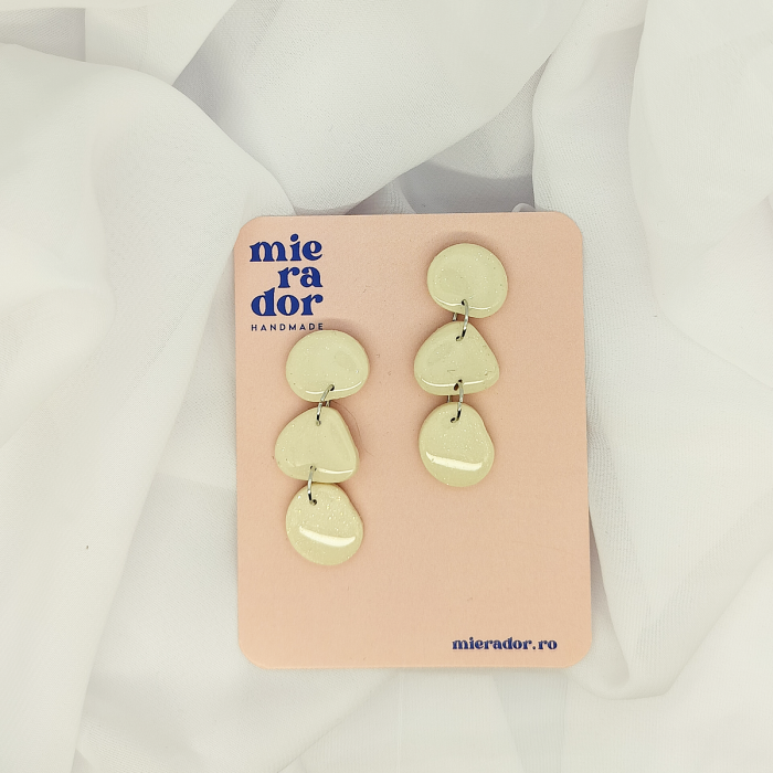 Cercei statement realizați manual din lut polimeric, cu un design inspirat de lumina lăptoasă a plajelor cu nisip alb și de senzația de calm pur. Tonurile de ivory sidefat și formele organice creează o bijuterie delicată, luminoasă și extrem de rafinată.